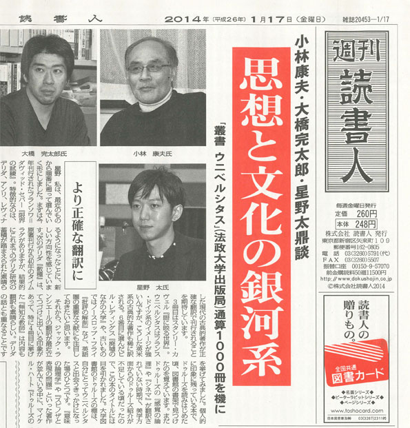 「週刊読書人」(2014年1月17日号)にて、《叢書・ウニベルシタス》1000番到達を取り上げた特集記事「小林康夫・大橋完太郎・星野太鼎談【思想と文化の銀河系】~叢書・ウニベルシタス通算1000冊を機に~」が掲載されました。